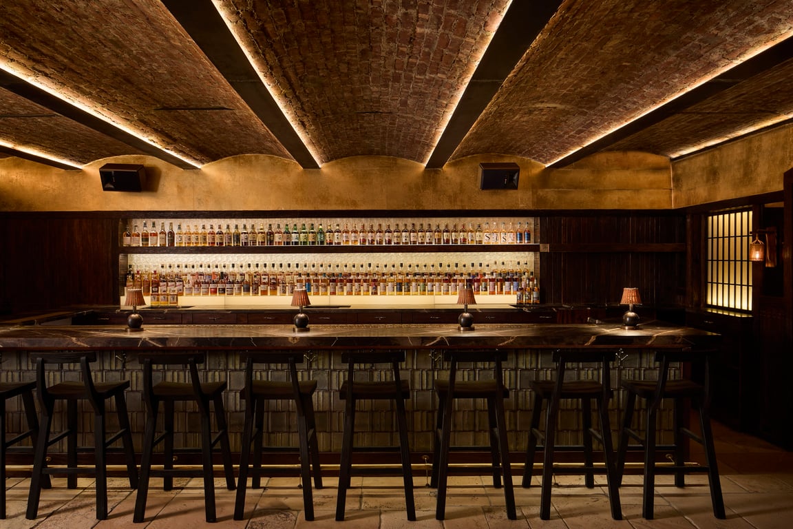 A few final design details complete the wabi-sabi tone: exposed brick ceilings arch overhead, casting shadows across limestone floors, salvaged wood walls, and panels of indigo-dyed denim adorned with Yokoi’s original artworks. Hazy, ambient lighting slows time, and the line between day and night gently dissolves.